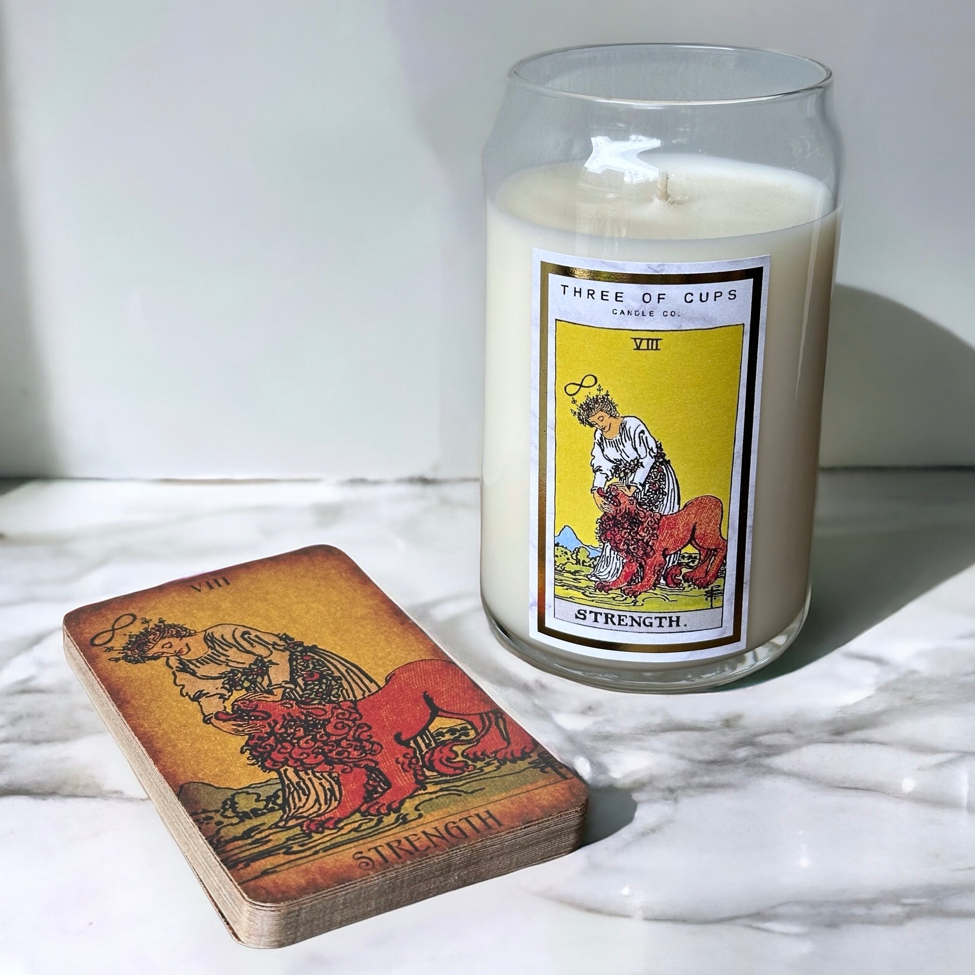 12 oz. soy candle scented with a blend of rosemary, wild sage and sandalwood. "Strength" tarot card represents courage, patience and bravery.